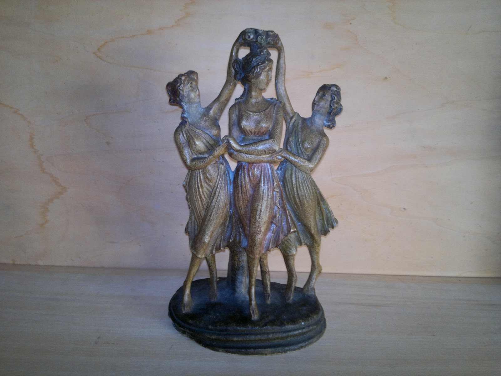 Escultura em pó de pedra de três mulheres, numa cena de coroação, bronze de arte, restaurada, com mais de 50 anos - 31xC18xL12cm